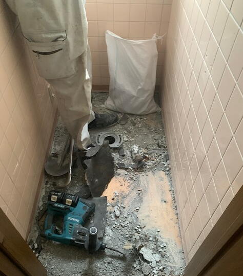 まず、新しい便器を設置するために、既存の便器を取り外します。その後、電動工具(ハツリ機など)を使用して、3cmの厚みがある硬いタイルとモルタル下地を細かく砕きながら、すべて撤去します。