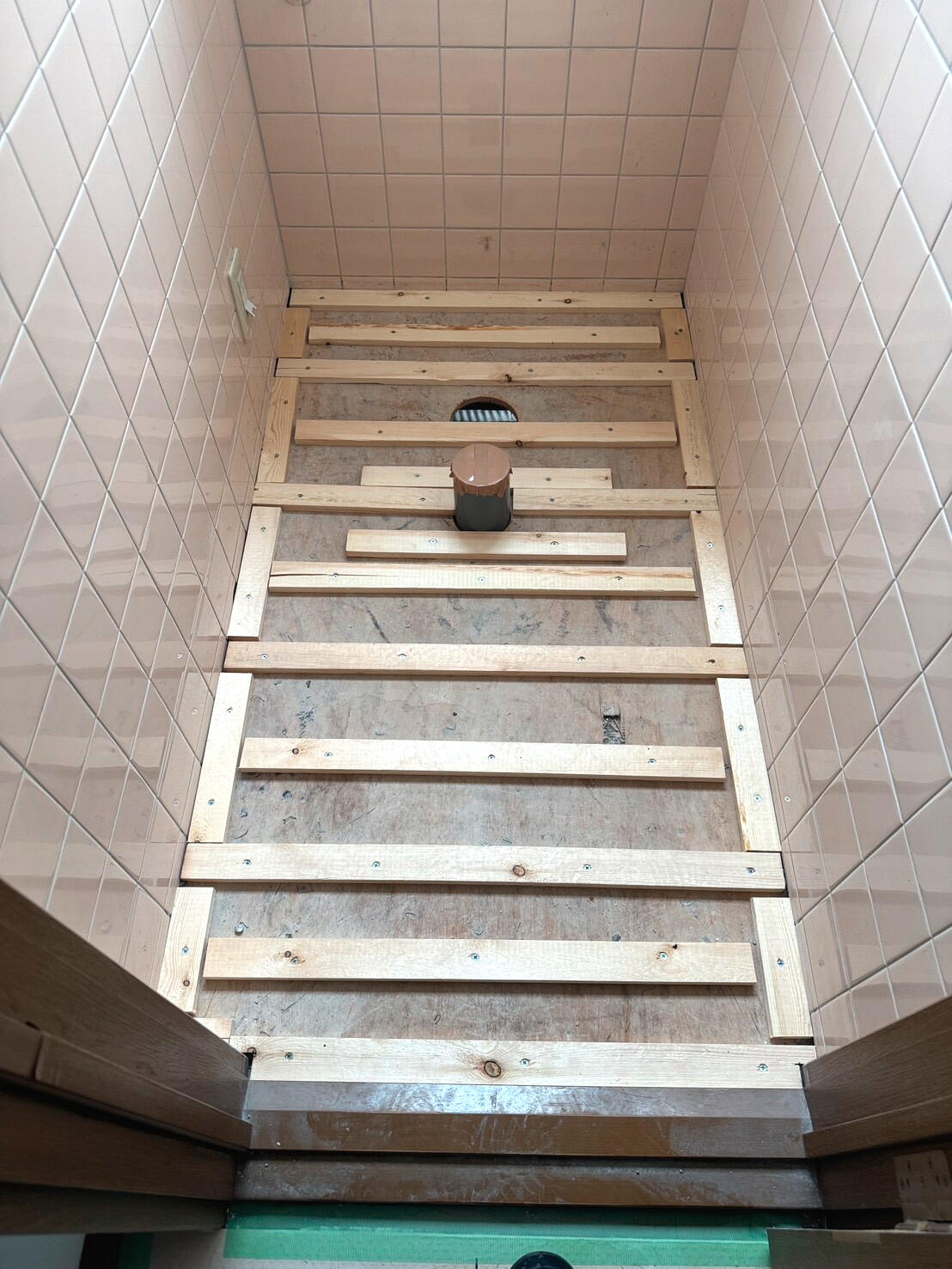 - レベル調整(高さ合わせ): 廊下の床高とトイレの床高がフラットになるように、根太の高さを精密に調整します。これで、つまずきの原因だった3cmの段差が解消されます。