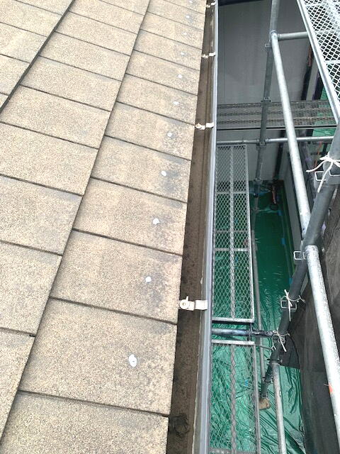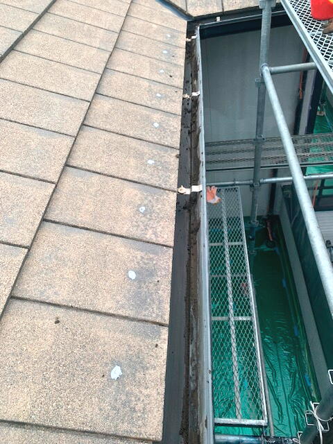 アイ・アール・オーでは、高所作業となる足場設置の機会を最大限に活用し、塗装作業とは別に、樋内部の徹底的な清掃と泥の除去をサービス(または適切な追加提案)として実施しています。