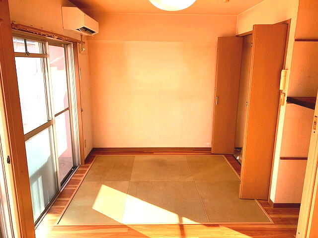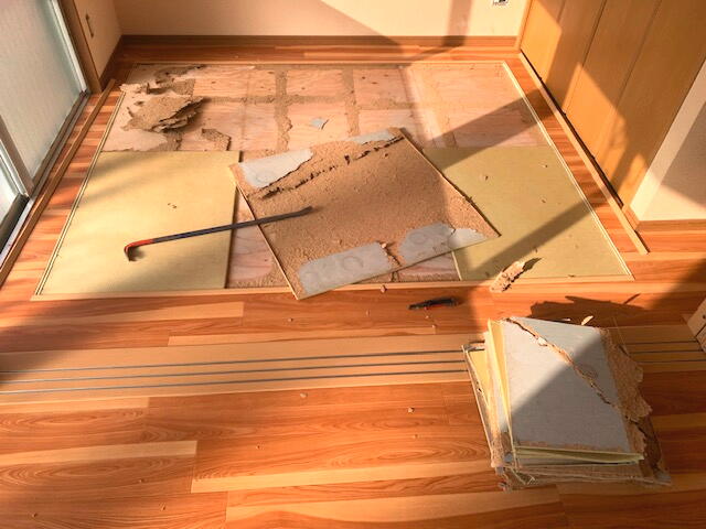 下地処理: ダメージを受けたタタミを撤去し、コンパネ(合板)を打って床面を強固に平滑化。