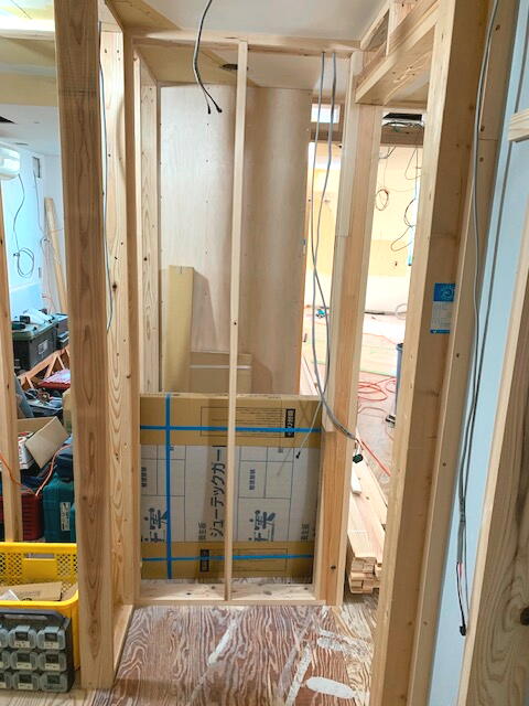 今回は、間取り変更に欠かせない間仕切り壁の造作工事、それに続くユニットバスの組立、そして浴室・洗面を先行して仕上げるための給湯器交換工事の様子をお届けします。