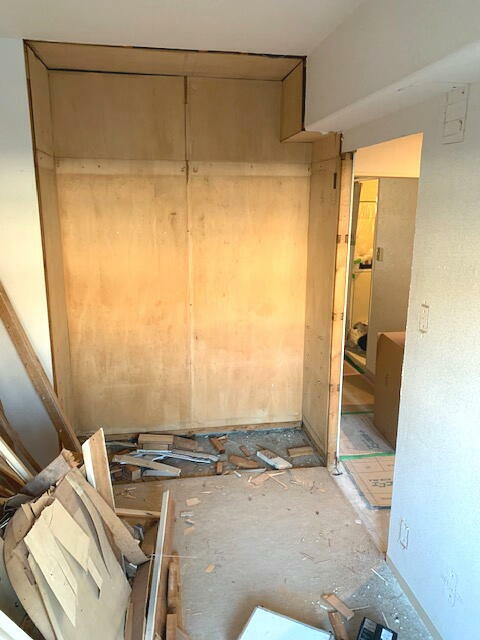 さて、ここからが今回の現場でのハイライトです。 マンションのクローゼットの間仕切り壁を撤去した際、最も影響が大きかったのが**「床の取り合い」**でした。